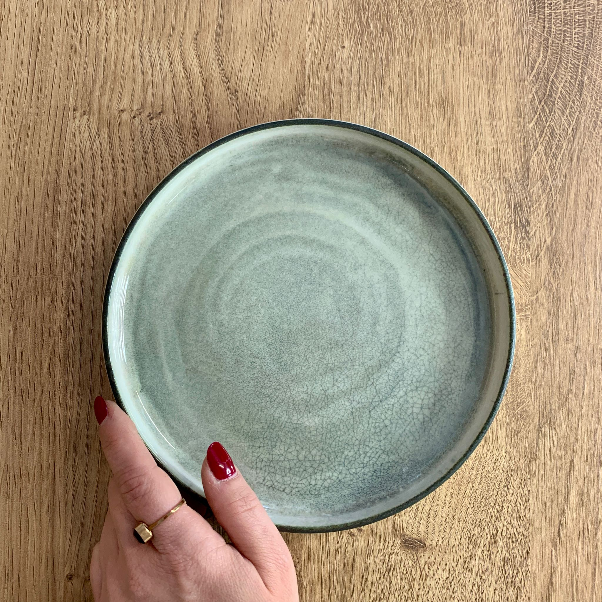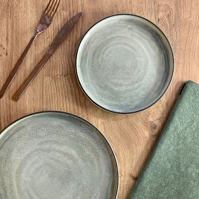 Il design richiama l’eleganza della ceramica giapponese raku, con sfumature grigio/verde effetto naturale e decori digitali che riproducono l’aspetto artigianale fatto a mano. Una soluzione perfetta per ristoranti moderni, locali green e ambienti attenti alle tendenze eco e naturali.