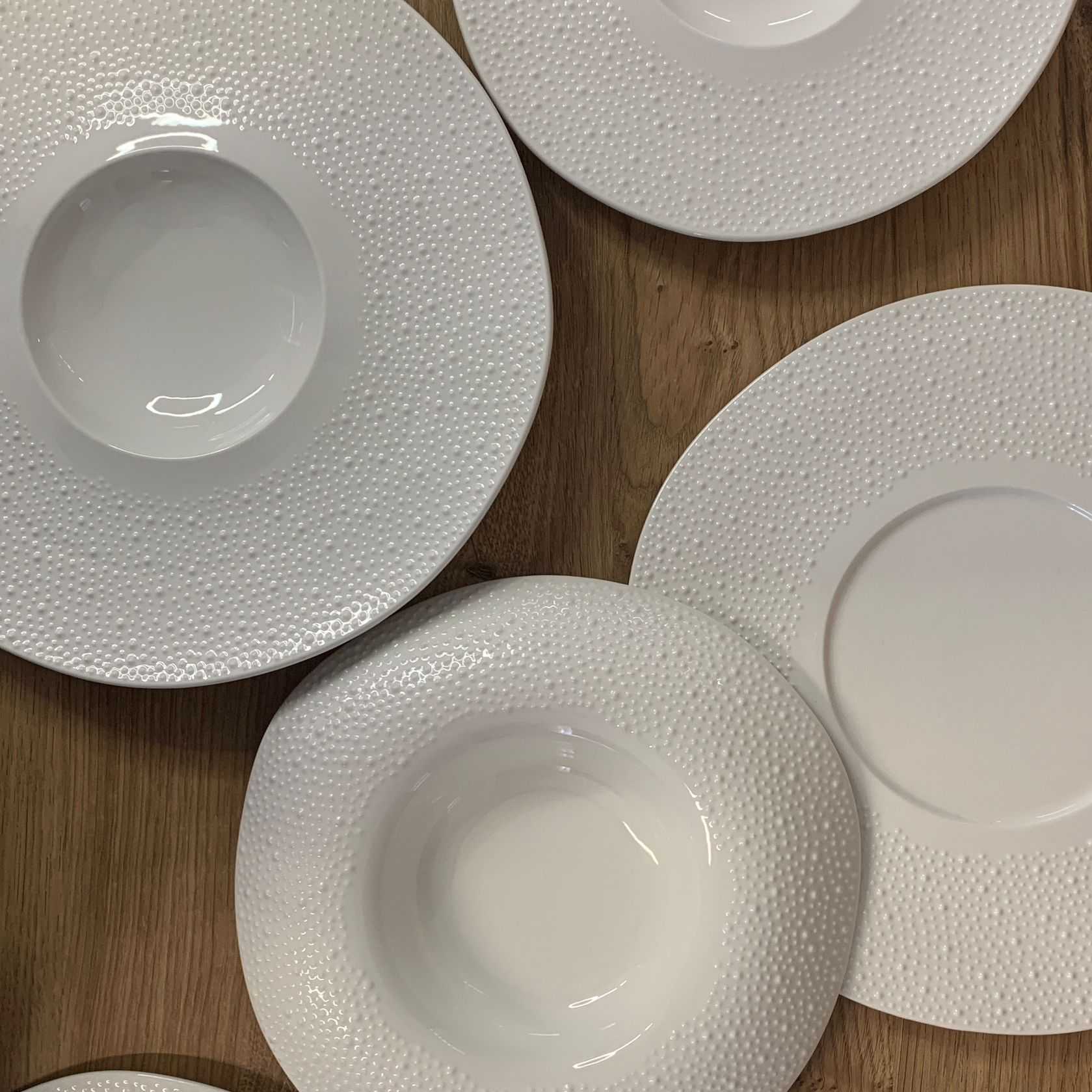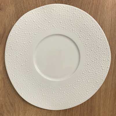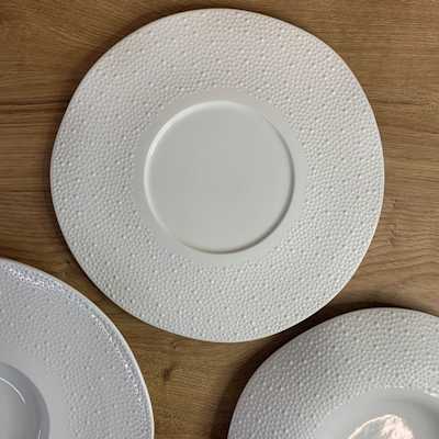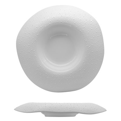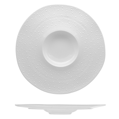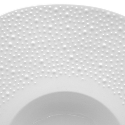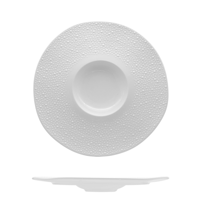 Le forme leggermente irregolari e il decoro in rilievo a puntini rendono il piatto riconoscibile e distintivo, ideale per ristoranti che vogliono differenziarsi nella mise en place.