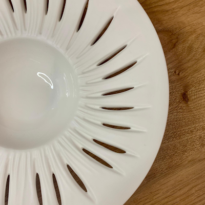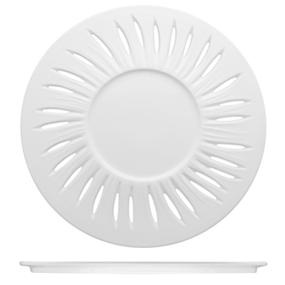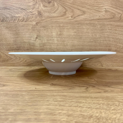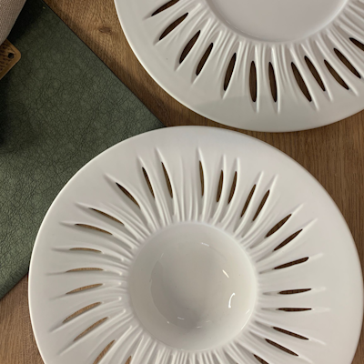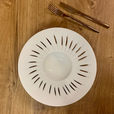 La superficie del piatto è caratterizzata dalla particolare lavorazione a tagli e fili in rilievo della linea Zefiro, ispirata al movimento dell’erba mossa dal vento. Questo dettaglio estetico crea profondità visiva e un raffinato gioco di luci che incornicia il cibo, rendendo ogni impiattamento più scenografico e valorizzando il lavoro dello chef.