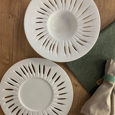 Il piatto fondo gourmet Zefiro è la soluzione ideale per locali che desiderano distinguersi con una mise en place moderna, elegante e perfettamente coordinata con il resto della linea.
