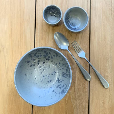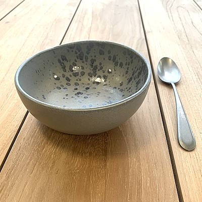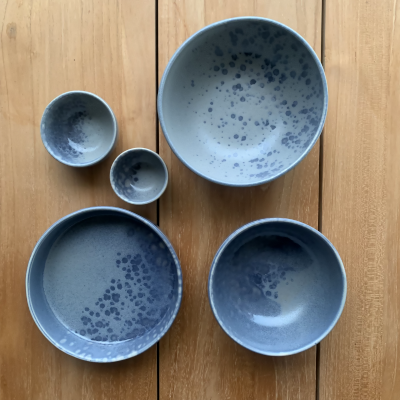 Il design contemporaneo di questa bowl, caratterizzato da caotici tocchi di colore e vivaci tonalità blu su uno sfondo grigio, si distingue per la sua particolarità che rende ogni pezzo un articolo unico.