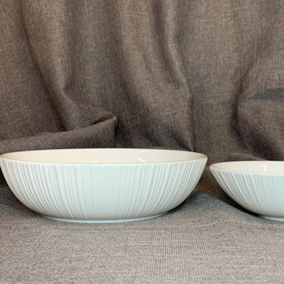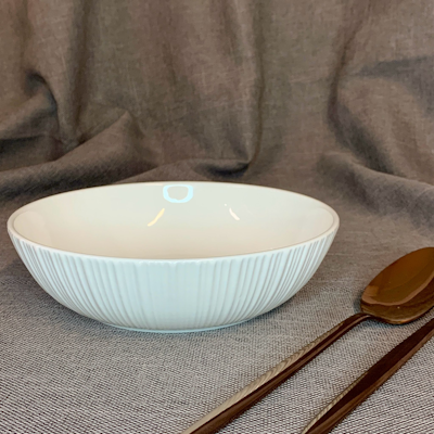 Ciò che distingue questo piatto è la sua texture esterna finemente lavorata, caratterizzata da un delicato motivo a rilievo verticale che aggiunge profondità e stile senza rinunciare alla semplicità. La superficie interna, invece, rimane liscia e pulita, creando un piacevole contrasto visivo e tattile che eleva l’esperienza a tavola.