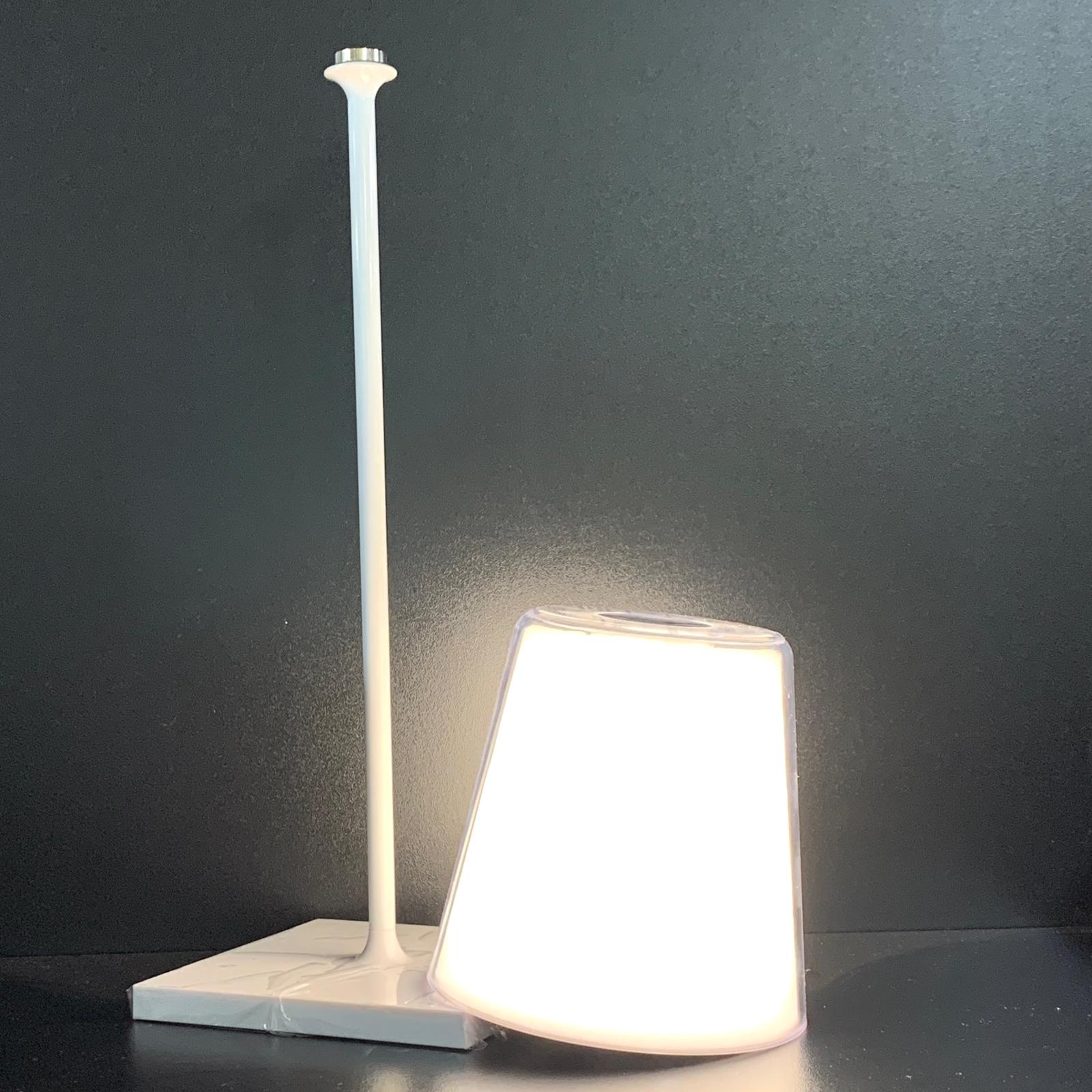 La testa staccabile in plastica trasparente permette diverse modalità di illuminazione: solo verso il basso per una luce più discreta, oppure diffusa a 360° per un effetto scenografico.