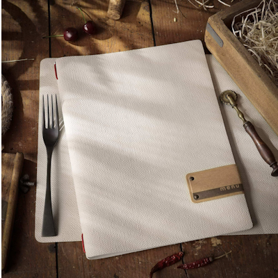Il portamenu Linea JUTA colore avorio in PVC antibatterico è pensato per locali che desiderano un accessorio elegante e professionale per la presentazione della carta menu.