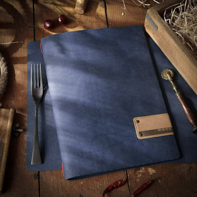 Il portamenu Linea JUTA colore blu in PVC antibatterico è una scelta professionale per la presentazione del menu in ristoranti, hotel, pizzerie e locali horeca.