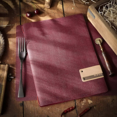 Il portamenu Linea JUTA colore bordeaux in PVC antibatterico è progettato per offrire una presentazione elegante e professionale del menu nei ristoranti, hotel e pizzerie.